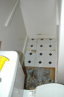 For a small room it is a somewhat ambitious job: new vanity and sink, new mirror, new shelves and bath accessories and new paint and flooring. I started demo a while ago by removing the old flooring and the misc. existing accessories.